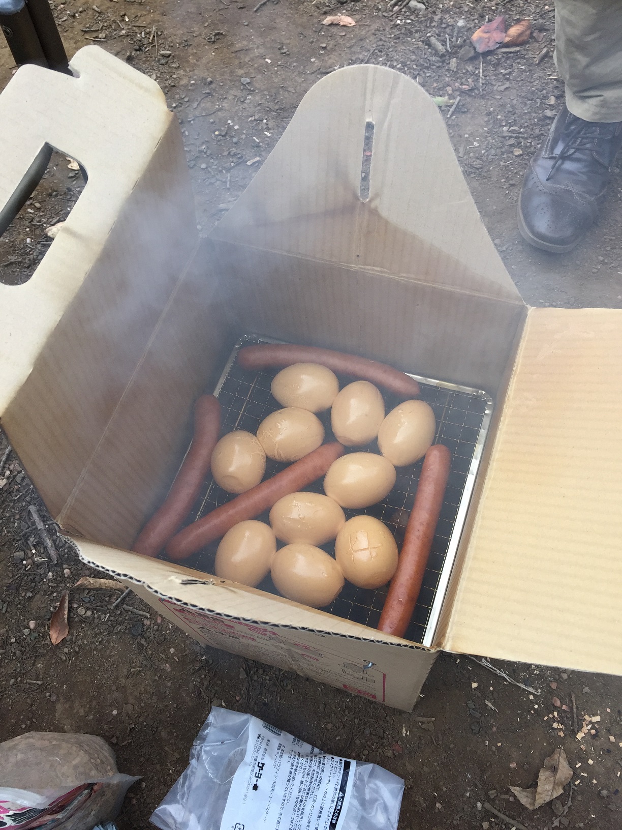 これが卵とソーセージの燻製です。美味しそーでしょ!