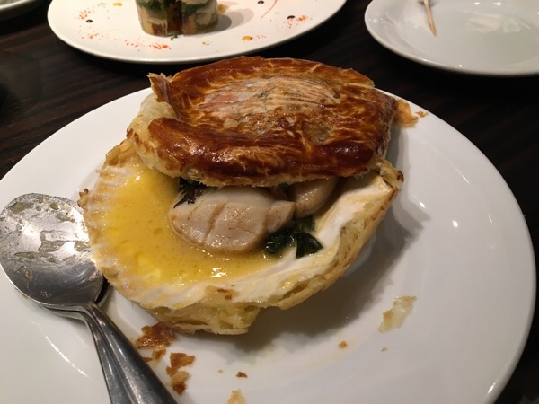 ふたのようにあるのがホタテの殻が入ったパイです。殻の周りのパイは食べられます。